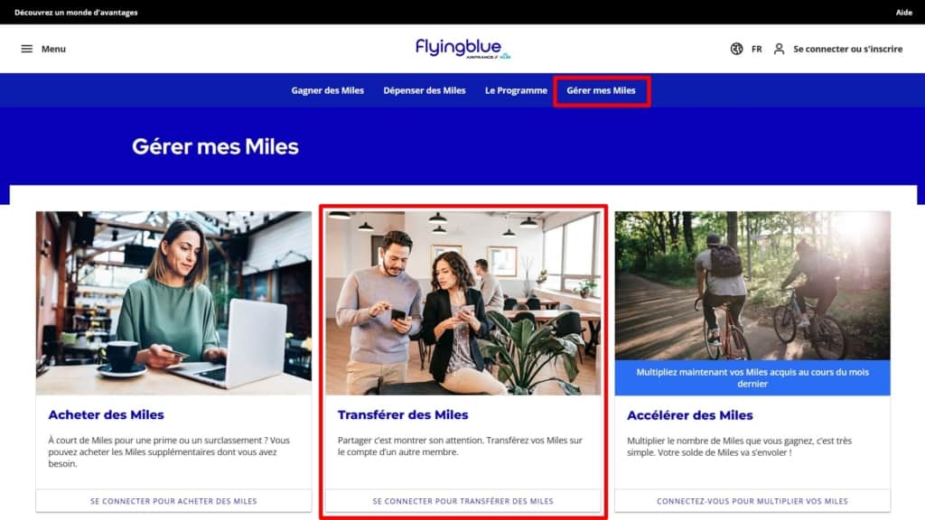 Para continuar, acceda a la página de transferencia de millas en el sitio web de Flying Blue (menú Gestionar mis Millas > Transferir Millas o Gestionar mis Millas > Transferir Millas). Si aún no ha iniciado sesión en su cuenta Flying Blue, deberá autenticarse.