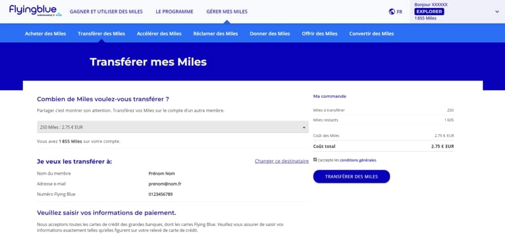 Luego simplemente complete el formulario con los datos de contacto del beneficiario de la transferencia (apellido, nombre, dirección de correo electrónico y número de tarjeta Flying Blue) y luego pague las tarifas.