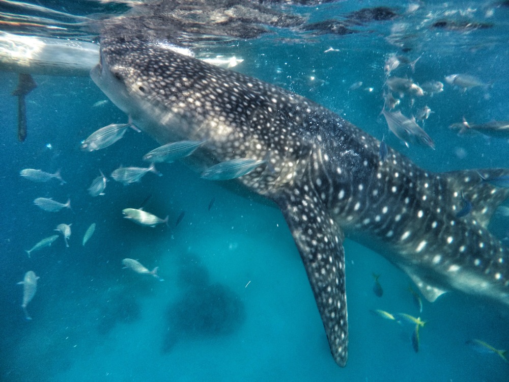 Nos deslizamos suavemente por el borde del bote y nos metimos en el agua oscura. Estaba bastante oscuro debajo de nosotros y no me gustó mucho, pero los barqueros pronto nos gritaron que nadáramos hacia ellos donde estaban poniendo comida en el agua. En cuestión de segundos vimos a este tiburón ballena GIGANTE venir hacia nosotros. Fue increíble. Abrió su boca de un metro de ancho y galones de agua fluían a través de ella y se quedaba con las partes buenas mientras el agua se filtraba a través de sus enormes branquias. Cuando sus aletas se elevan sobre el agua, podría confundirse con pensar que se trata de un tiburón.