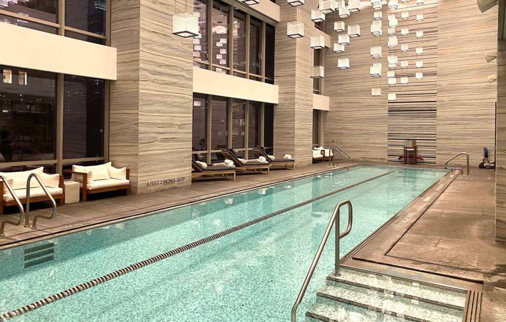 En mi opinión, lo mejor de la experiencia en Park Hyatt New York es el área de piscina y gimnasio ubicada encima de todas las habitaciones del hotel en el edificio.