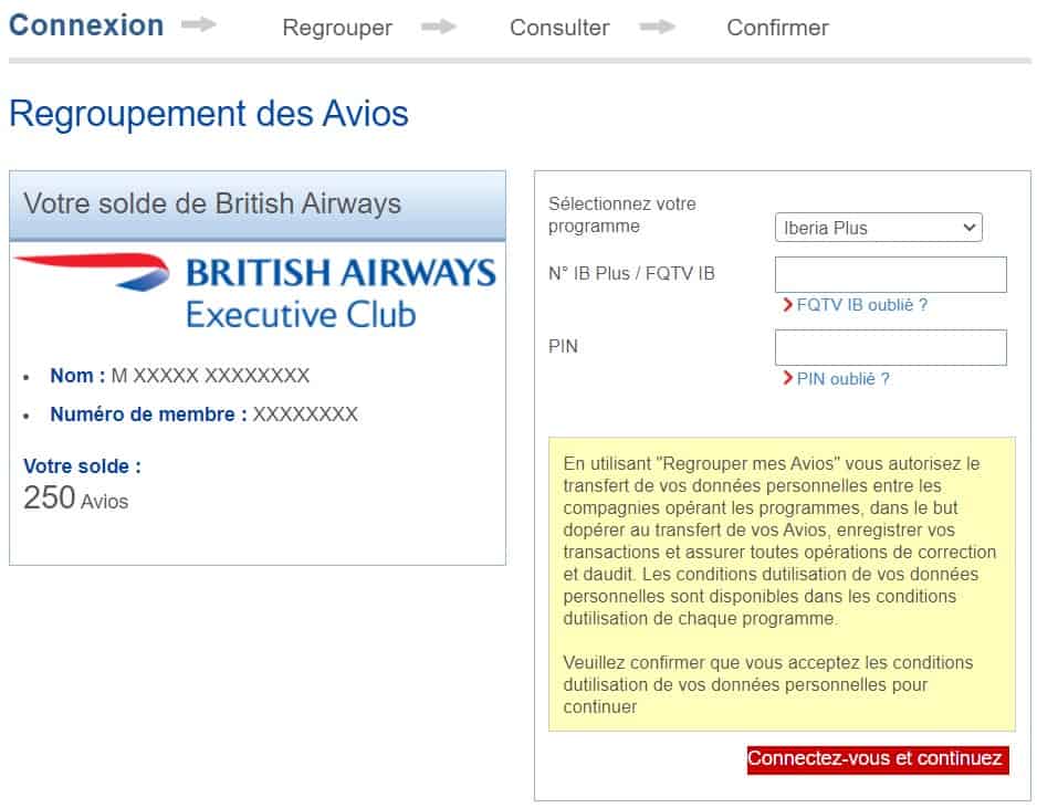 El módulo “Combinar Avios” le permite transferir Avios entre las cuentas British Airways Executive Club y Qatar Airways Privilege Club: elija el sentido de la transacción haciendo clic en las flechas de inversión, introduzca el número de Avios a transferir y luego valide la operación.