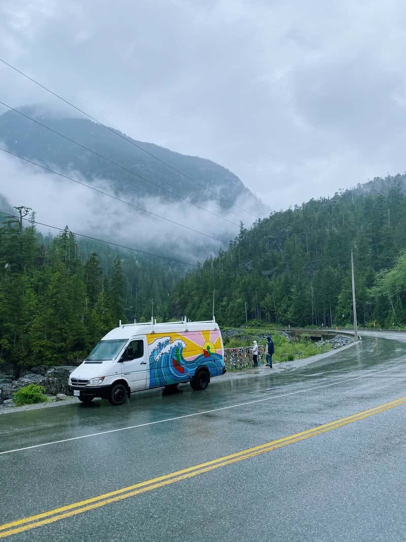 Comenzamos nuestro viaje de campamento en Tofino temprano a la mañana siguiente. Nos despertamos con una lluvia increíble que no iba a desaparecer y se suponía que se quedaría todo el fin de semana, ¡pero eso es Tofino para ti! Así que siempre empaca mucha ropa para la lluvia y varios pares de pantalones.